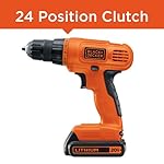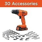 The Black and Decker LD120-VoltA 20-Volt Max Lithium Drill/Driver with 30 Accessories come with the Black and Decker 20-volt max Lithium Ion Battery. These batteries are always ready, holding a charge up to 18 months. This drill provides an extra level of control with a 24 position clutch that helps to prevent stripping and overdriving screws. It has a soft grip handle that provides added comfort during use and a light weight to prevent user fatigue. This drill is ideal for drilling and screwdriving through wood, metal, and plastic. The LD120-VoltA set includes: LD120 20-Volt MAX Lithium Drill/Driver, (1) LB20 20-Volt MAX Lithium Ion Battery, (1) LCS20 Charger, (6) Brad Point Drill Bits, (10) 1-Inch Screwdriving Bits, (9) 2-Inch Screwdriving Bits, (4) Nut Drivers, (1) Magnetic Bit Tip Holder and is backed by Black and Decker’s 2 year limited warranty.